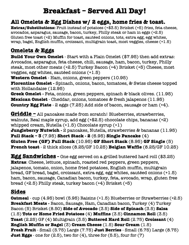 Start with a plain omelet. Add cheese, meats or veggies for an additional charge. Comes with toast & home fried potatoes.