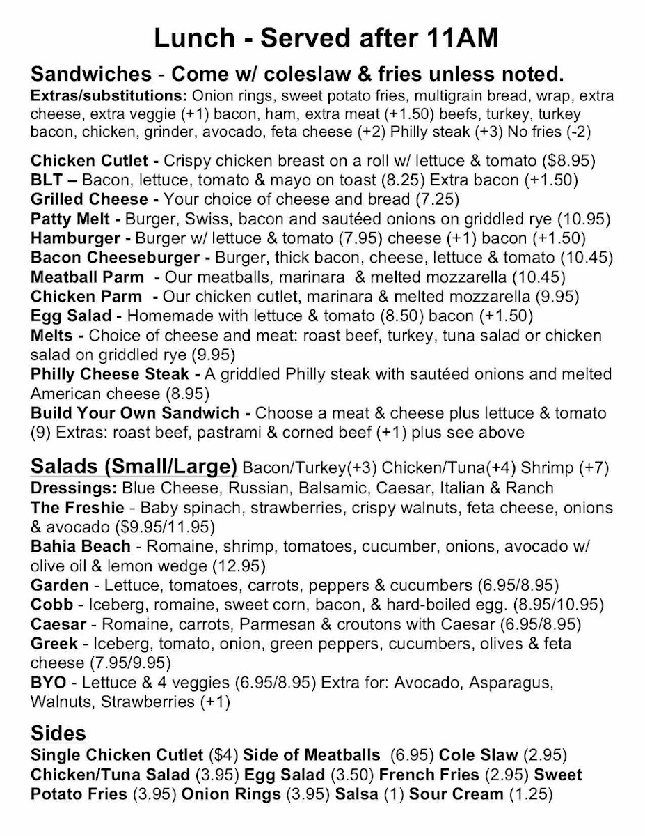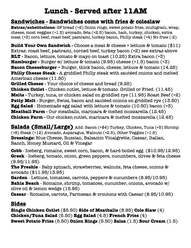 Choice of cheese and meat: roast beef, turkey, tuna salad or chicken salad on griddled rye. Comes with a small side of coleslaw and French fries.