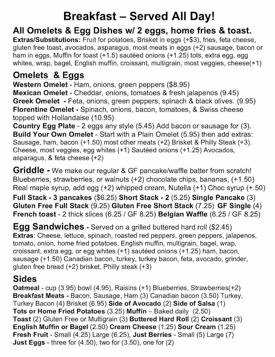 An omelet with feta cheese, onions, green peppers, spinach and black olives. Comes with toast & home fried potatoes.